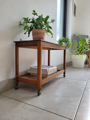 This is so dinky, beautiful piece of nostalgia and it's so practical. Teak table top (newly repolished) with Magazine /book rack below. Excellent condition considering it's at least 50 years old. On 4 metal castor wheels (these go on forever). Also perfect little entertainment trolley. Size is 74cm wide x 46cm high x 30cm deep. Based in Dunadry, you are welcome to view.