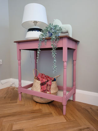 Mahogany Table Hand Painted in Love Letter Pink. Strong sturdy side table or Hall Table, the top is solid mahogany and the legs are solid oak. Wouldn't get that quality in shops these days or at this price! Space underneath for baskets of shoes, hats, scarves, what ever you want etc. This table is circa 1940s, had a slight crack on the top, which has been filled and strapped and is ready for a new home. Check out how beautiful the wooden table top is. It's currently on display at my shop space located in the lovely Mid Town Makers Craft Shop, Church Street, Ballymena. Any questions, just get in touch.