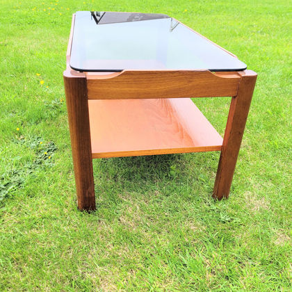 Lovely Mid century Myer Coffee Table with Magazine shelf. Excellent Condition. Solid Teak with Smoked Glass Top. Super practical and easy to keep. Dimensions: 86cm x 40cm x 37cm high.